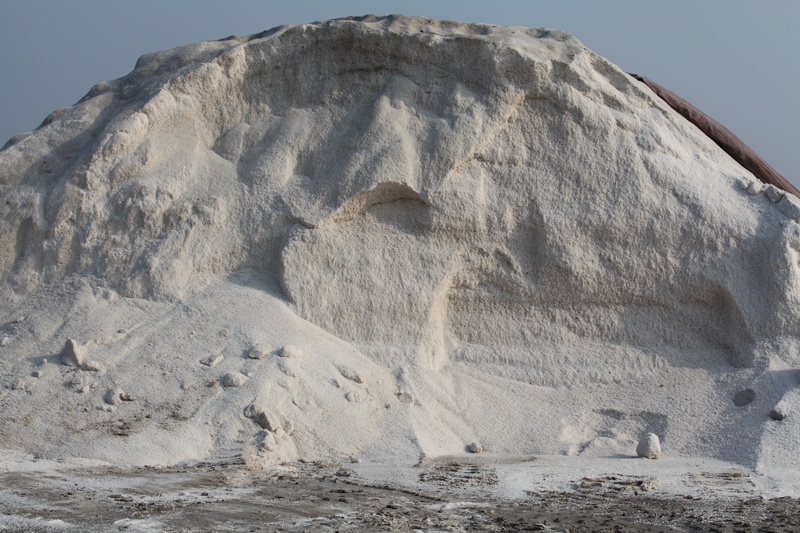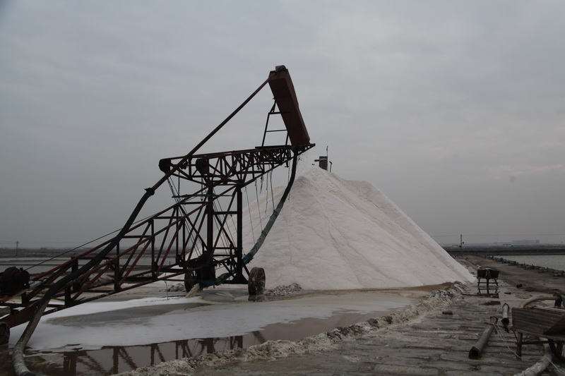 堆坨:过去用耙子捞盐后,以人力用扁担、条筐挑上小坨堆存,盖以草苫,延续很久。1958年改用胶轮小车,70年代用绳索牵引机带动大耙捞盐,用运盐车运上小坨, 1981年采用收盐机收盐,用管道输洗上坨,盐工劳动负荷大大减轻。近年来,采用小推车推盐和管道堆坨相结合的的收盐方式,虽然辛苦,劳动强度大,但产盐的质量明显提高。目前,盐场均为大坨堆盐,塑苫盖坨。