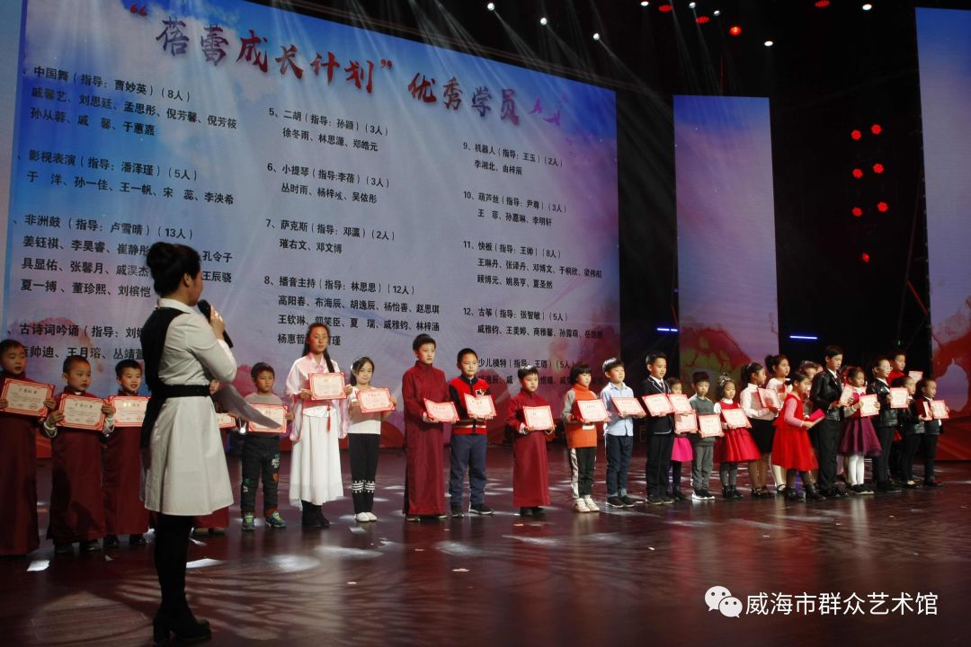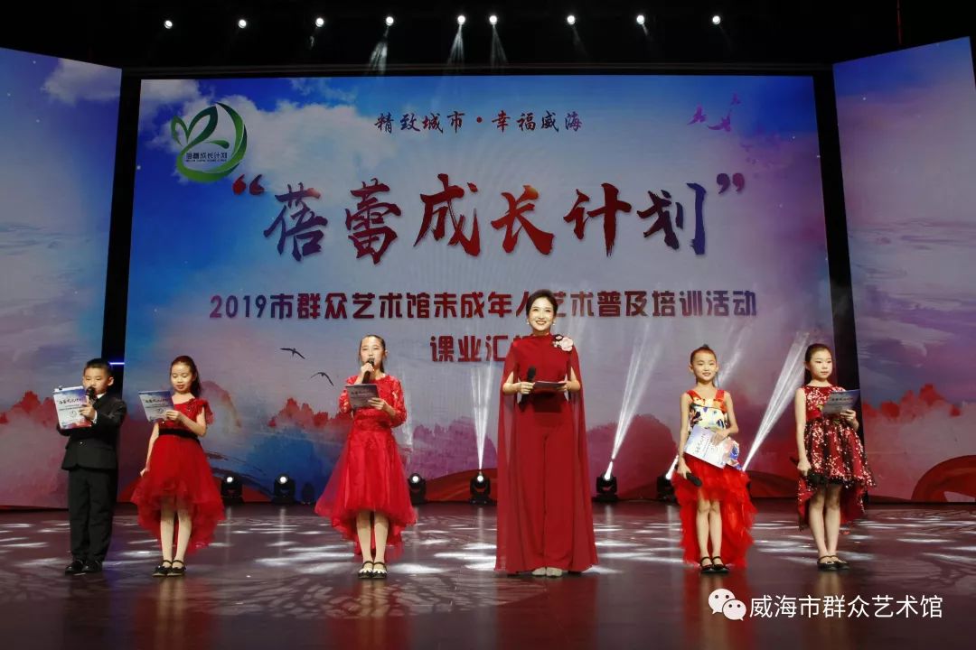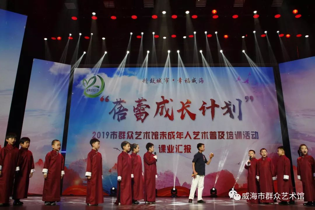 2月17日晚7点,由威海市群众艺术馆主办的“蓓蕾成长计划”——2019市群众艺术馆未成年人艺术普及培训活动课业汇报表演在海洋剧场精彩上演,来自不同培训班的小学员们,用精彩的表演展示了他们丰硕的学习成果。
