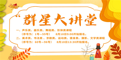 秋季报名丨“群星大讲堂”2023秋季艺术培训活动将于8月18日开始报名,敬请市民朋友及时关注